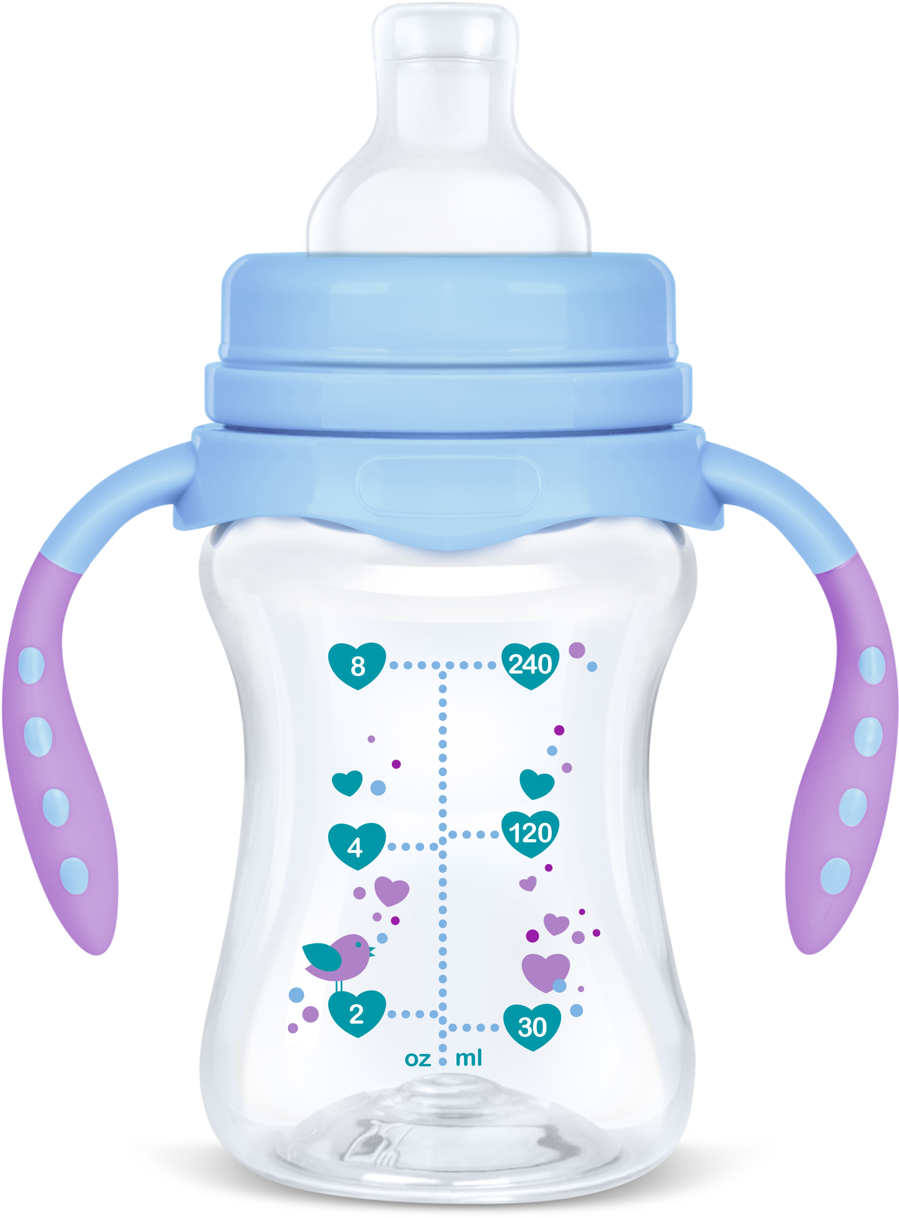 Nem folyó, 240 ml-es tanuló üveg fogantyúval, a szoptatás, valamint a cumisüvegből való etetés, és az önálló ivás közti átmenet tanulásához. Kényelmes és puha szilikon ivócsőr, ergonomikus fogantyú.
